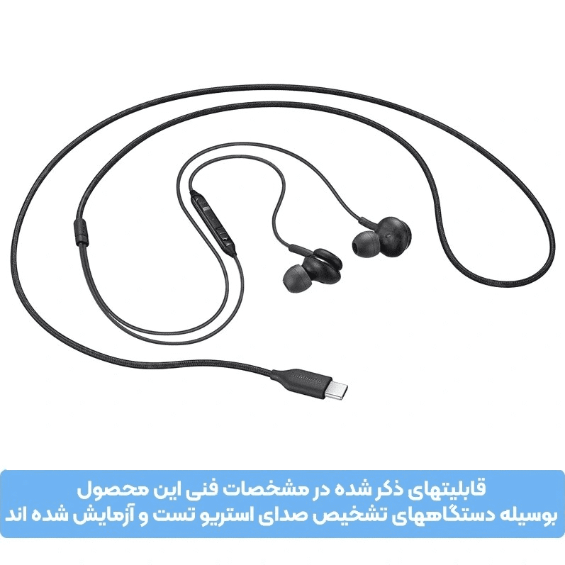 هندزفری تایپ c سامسونگ  ای کی جی از طراحی AKG بهره می برد و حجم صدای بسیار خوبی را منتقل می کند .طول کابل آن 1.2 متر می باشد که طول استاندارد استفاده شده هندزفری های سیم دار می باشد . درون جعبه هندزفری تایپ c سامسونگ چهار عدد سری سیلیکونی اضافه قرار دارد که برای سایز های مختلف گوش می باشد، که شما می توانید با توجه به نیاز خود آنها را تعویض نمایید.